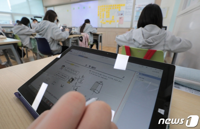 서울 중구 창덕여중에서 학생들이 스마트패드와 스마트펜 등 기기를 활용해 수업에 참여하고 있다.2021.3.18/뉴스1 © News1 이성철 기자