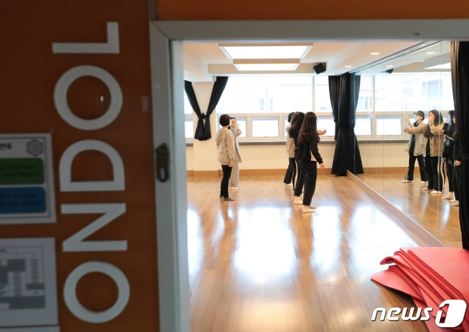 창덕여중 '온돌방'에 학생들이 신발을 벗고 올라가 체육 활동을 하고 있다. 2021.3.18/뉴스1 © News1 이성철 기자