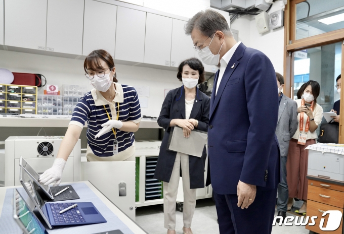 문재인 대통령이 지난해 8월18일 창덕여중을 방문해 스마트기기 관련 설명을 듣고 있다. (청와대 제공) 2020.8.18/뉴스1