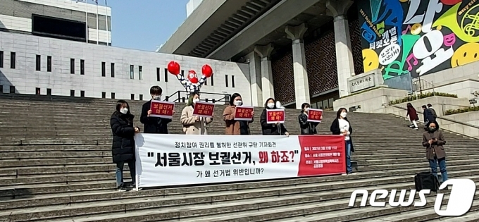 서울시장위력성폭력사건공동행동은 23일 서울 종로구 세종문화회관 앞에서 '정치참여 권리를 불허한 선관위 규탄' 기자회견을 열었다. © 뉴스1 김도엽 기자