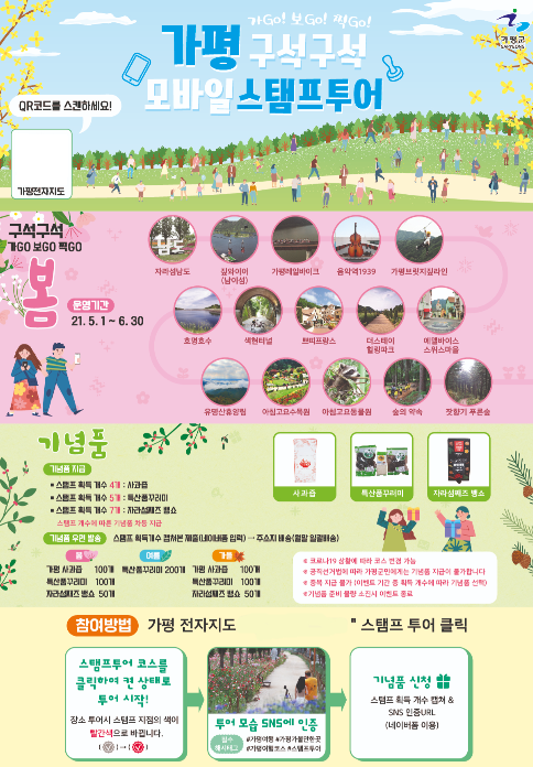 가평군은 코로나19시대에 안전한 모바일기반 비대면 관광상품으로 여행도 즐기고 스탬프 개수에 따라 기념품을 받는 ‘가평 구석구석 모바일 스탬프투어’ 이벤트를 운영한다고 7일 밝혔다.‘가평 구석구석 모바일스탬프투어’는 자라섬 남도, 쁘띠프랑스, 아침고요수목원 등 가평 주요 관광지 14곳을 대상으로 모바일 스탬프를 찍을 수 있고, 현재 봄 시즌 스탬프투어 이벤트는 6월 31일까지 진행한다.