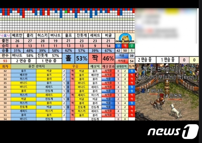 리니지 불법 사설서버에서 진행하는 투견게임이 온라인 방송 플랫폼을 통해 생중계되고 있다. 중계 화면에는 홀짝으로 나눠진 몬스터들의 승률 등의 정보가 공유되고 있다. 2021.5.21/뉴스1 © News1 박동해 기자