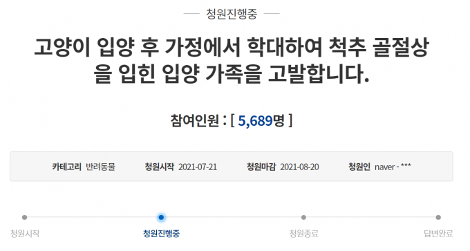 "고양이 입양 후 가정에서 학대하여 척추 골절상을 입힌 입양 가족을 고발합니다"지난 21일 청와대 청원 게시판에 고양이를 입양하고 학대한 사람들이 있다는 내용이 담긴 청원이 올라왔다.