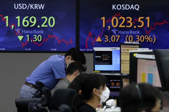 27일 오후 서울 중구 하나은행 명동점 딜링룸 전광판에 코스닥 지수가 전 거래일 대비 3.07p(0.30%) 오른 1,023.51을 나타내고 있다./사진=뉴스1
