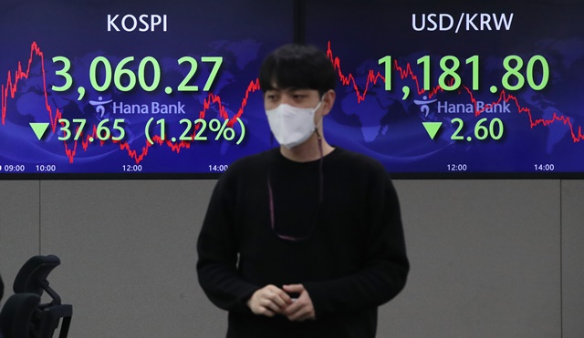 29일 오후 서울 중구 하나은행 딜링룸 전광판에 코스피 지수가 전 거래일보다 37.65 포인트(1.22%) 하락한 3060.27을 나타내고 있다./사진=뉴스1