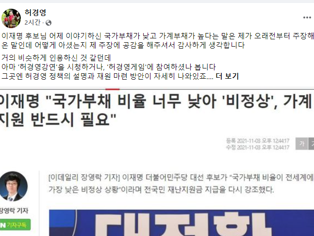 허 명예대표는 “비슷한 정책 방향성을 갖고 국민을 생각하는 마음이 큰 것으로 보이는데 이 후보에게 대국민 정책 토론을 제안한다”며 “국가 미래의 방향성을 심도있게 이야기 나눌 수 있는 자리가 될 것”이라고 밝혔다. 그러면서 “허경영의 토론장은 언제든 열려있으니 참여 의사를 밝혀주길 기다리겠다”고 덧붙였다. 이 후보는 지난 3일 국회에서 열린 민주당 중앙선거대책위원회 첫 회의에서 “대한민국은 가계부채 비율이 높고 국가부채 비율은 전세계에서 가장 낮은 비정상적인 상태다”라며 “국가 부채비율은 크게 장애가 되지 않는다는 사실을 인지할 필요가 있다”고 말했다. 그러면서 이 후보는 정부에 전국민 재난지원금 추가 지급을 촉구했다.