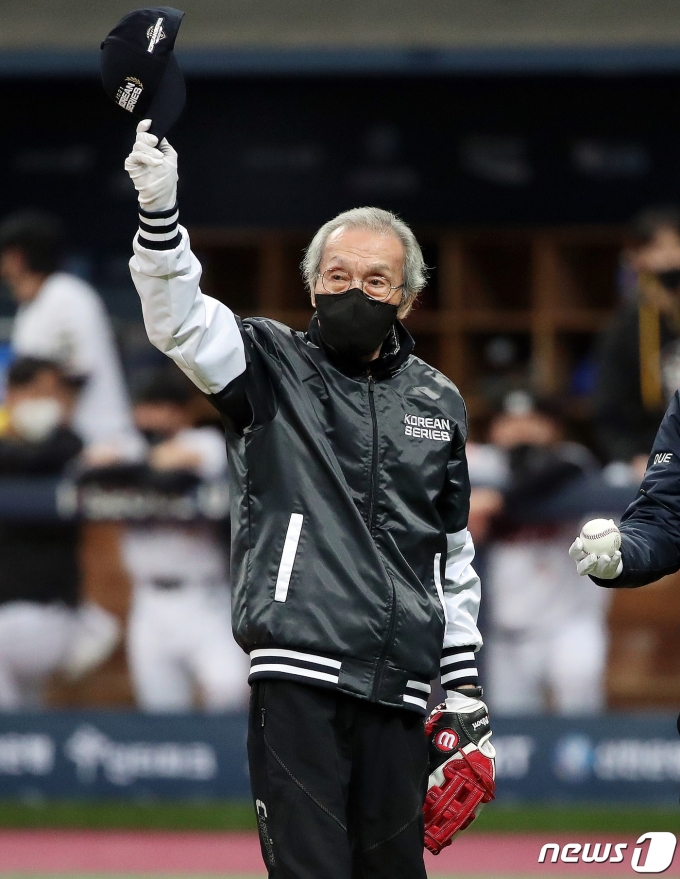 [사진] 오징어 게임 1번 참가자 오일남 시구하러 왔어요! 뉴스1 제공 |ViEW 1,848| 2021.11.14 14:08:08 (서울=뉴스1) 김진환 기자 = 14일 오후 서울 구로구 고척스카이돔에서 열리는 '2021 신한은행 쏠 KBO 한국시리즈’ 1차전 두산베어스와 kt 위즈의 경기에 앞서 넷플릭스 드라마 '오징어 게임'에서 열연을 펼친 배우 오영수 씨가 시구 전 야구팬들에게 인사하고 있다. 2021.11.14/뉴스1<저작권자 © 뉴스1코리아, 무단전재 및 재배포 금지> <저작권자 © ‘재테크 경제주간지’ 머니S, 무단전재 및 재배포 금지>