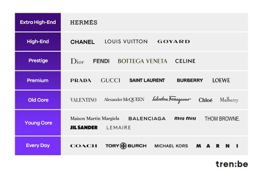 30일 명품 플랫폼 트렌비는 올해 8~10월 판매 데이터를 기반으로 최다 매출액과 검색량을 기록한 브랜드 중심의 '2021년 명품 계급도'를 발표했다. ▲엑스트라 하이엔드 ▲하이엔드 ▲프레스티지 ▲프리미엄 ▲올드코어 ▲영코어 ▲에브리데이 7개 등급으로 분류했다.