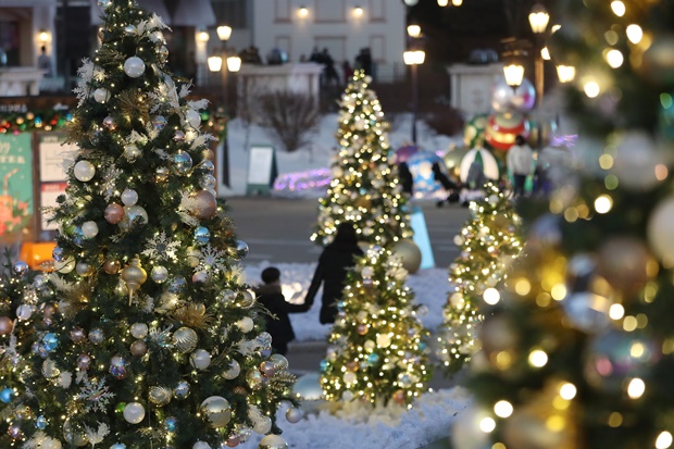 크리스마스인 25일은 서울의 아침기온 영하 14도로 떨어져 매우 추운 날씨를 보일 예정이다. 사진은 지난 6일 오후 경기 용인시 처인구 에버랜드에 조성된 '골든 일루미네이션 윈터가든'에서 시민들이 화려한 야경을 감상하는 모습. /사진=뉴스1
