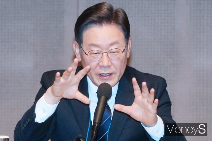 이재명 더불어민주당 대선후보가 6일 서울 중구 세종대로 프레스센터에서 열린 한국행정학회 주최 대통령선거 후보자 초청 토론회에서 기조연설을 마치고 대화하고 있다.