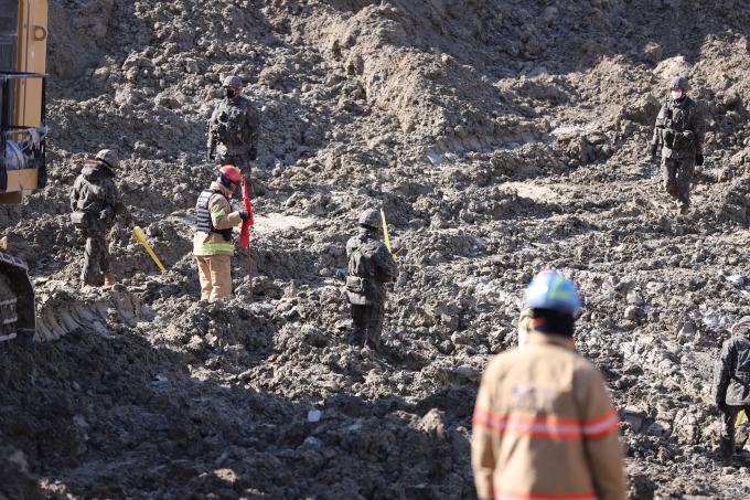 지난 2일 경기 양주시 삼표산업 골재 채취장 매몰사고 현장에서 소방대원들이 실종자 수색작업을 하고 있다. / 사진=소방청