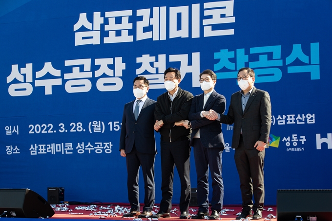 현대제철이 성수동 삼표레미콘 공장을 삼표산업에 매각하려는 모습과 과거 현대엠코에 상봉동 부지를 매각한 모습이 유사하다는 목소리가 나온다. 사진은 지난달 28일 성수동 공장 철거 착공식에 참석한 서상원 현대제철 경영지원본부장, 오세훈 서울시장, 정원오 성동구청장, 윤인곤 삼표산업 대표(왼쪽부터). /사진=뉴스1