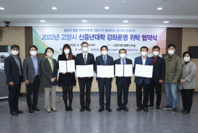 고양시(시장 이재준)가 2022년 고양시 신중년대학 강좌 운영을 위한 업무협약을 관내 4개 대학과 체결했다고 15일 밝혔다. 협약에 참여한 대학교는 중부대학교, 동국대학교, 한국항공대학교, 농협대학교다. 시는 위 대학들과 협력해 신중년대학을 운영해 신중년(만50세에서 만65세 미만) 고양시민의 인생 재설계를 지원할 예정이다.