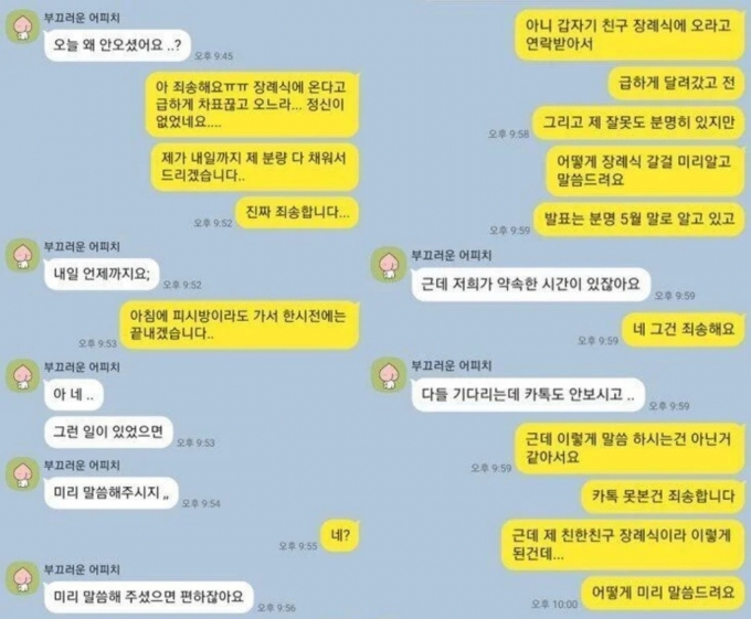 A씨는 "메시지 못 본 건 죄송하다. 근데 친한 친구 장례식이라서 이렇게 된 건데 어떻게 미리 말씀드리냐"고 말했다.
