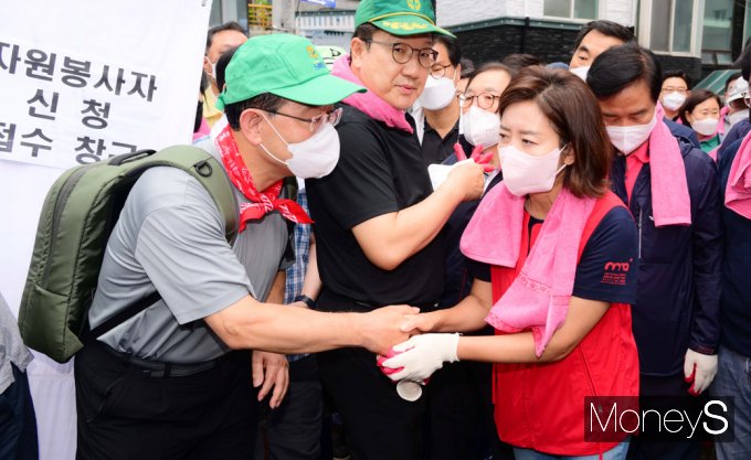 [머니S포토] 與 침수피해 자원봉사 속 인사 나누는 주호영·나경원