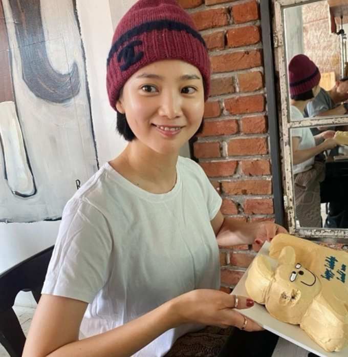 사진 속 윤승아는 하얀색 반팔티에 와인색 비니모자를 쓰고 강아지 모양의 케익슬 손에 든 채 미소를 지고 있다.