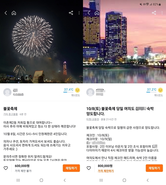 지난 6일 당근마켓에는 불꽃축제 당일 80만원에 여의도 소재 호텔 숙박권을 양도하겠다는 글이 올라왔다. /사진=당근마켓 캡처