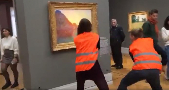 독일 현지 경찰은 클로드 모네의 작품 '건초더미'에 으깬 감자를 던진 환경운동가들을 재산침해와 무단침입 등 혐의로 체포했다. 사진은 독일 환경운동가들이 이날 '건초더미'에 으깬 감자를 던지는 모습. /사진=트위터 캡처