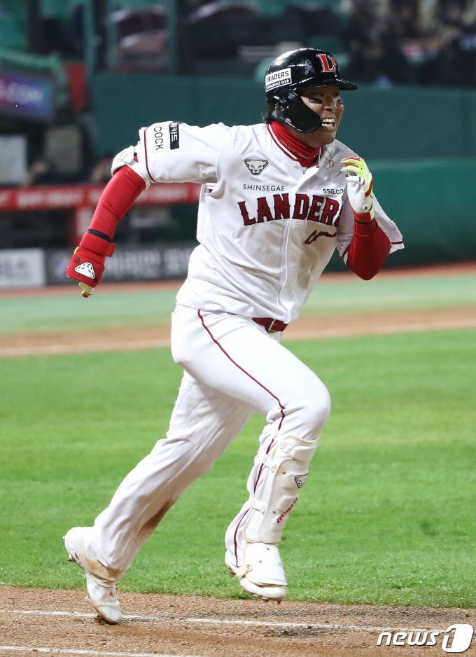 (인천=뉴스1) 임세영 기자 = 8일 오후 인천시 미추홀구 SSG 랜더스필드에서 열린 프로야구 '2022 신한은행 SOL KBO 포스트시즌' 한국시리즈 6차전 키움 히어로즈와 SSG 랜더스의 경기 3회말 2사 2,3루 상황 SSG 한유섬이 1루수앞 땅볼을 치고 전력질주를 하고 있다. 2022.11.8/뉴스1