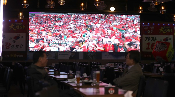 28일 밤 10시 2022 FIFA 카타르월드컵 대한민국 축구 국가대표팀의 조별리그 2차전이 열리면서 지상파 드라마, 예능이 모두 결방을 확정했다. 사진은 2022 카타르월드컵 대한민국과 가나의 경기를 앞둔 28일 오후 서울 시내의 한 주점을 찾아 대형 스크린 앞에서 맥주를 마시고 있는 시민. /사진=뉴스1