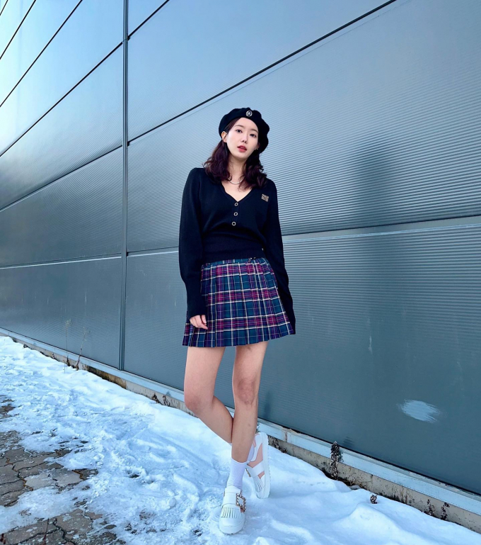 임수향은 네이비 컬러 브이넥 니트톱에 체크 패턴 플리츠 미니 스커트를 입고 여기에 블랙 베레모를 착용해 뉴트로 감성의 프레피룩을 완성했다. 특히 그녀는 나이를 가늠하기 어려운 동안 미모와 완벽한 각선미를 뽐내 시선을 사로잡았다.