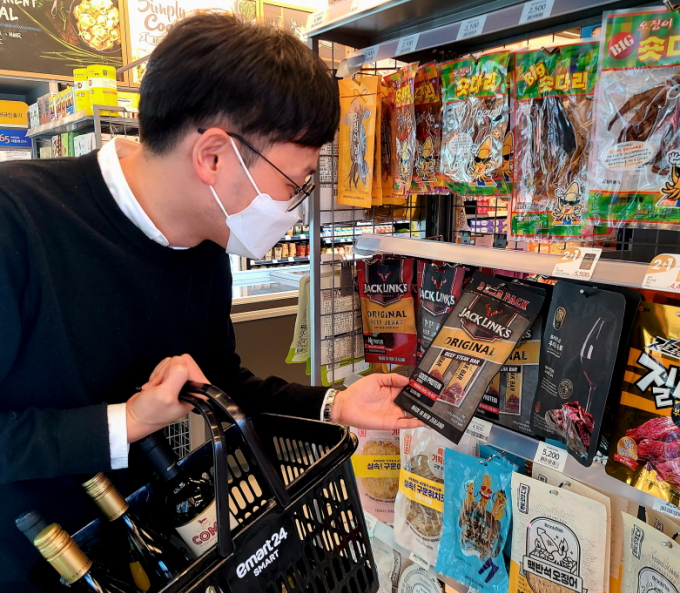 서울 성동구 성수동에 위치한 이마트24 매장에서 고객이 '잭링크스' 소고기 육포 상품을 살펴보고 있다. /사진=이마트24