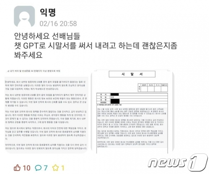 지난 16일 한 온라인 커뮤니티에는 '안녕하세요, 선배님들. 챗GPT로 시말서를 써서 내려고 하는데 괜찮은지 봐주세요'라는 제목의 글이 올라왔다.