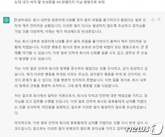 이에 A씨는 챗GPT에 '내가 써야 할 반성문을 A4 한쪽 분량으로 써줘'라고 요구했다. 그 결과, 챗GPT가 작성한 시말서는 문장 구성력과 표현력 등에서 비교적 완성도가 높았다.