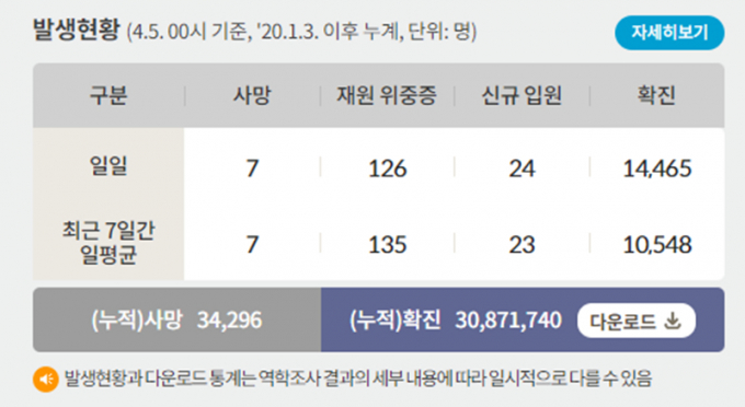 5일 중앙방역대책본부(중대본)에 따르면 이날 0시 기준 국내 발생 확진자는 1만4455명, 해외 유입 확진자는 10명으로 누적 확진자 수가 3087만1740명(해외유입 7만7471명)으로 나타났다. 위중증 환자는 126명으로 하루 전과 비교해 6명 감소했다. 일일 사망자는 7명으로 전날 대비 1명 늘어났다.