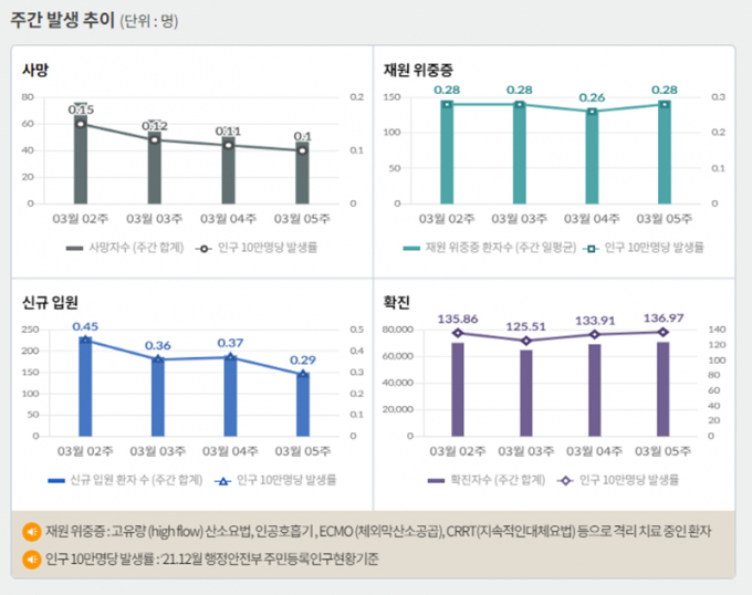 재원 위중증 환자는 전날(132명)보다 6명 감소한 126명이다. 최근 일주일 동안 추이는 143명→ 139명→ 142명→ 131명→ 136명→ 132명→ 126명 등이다. 주간 일평균 135명이다.