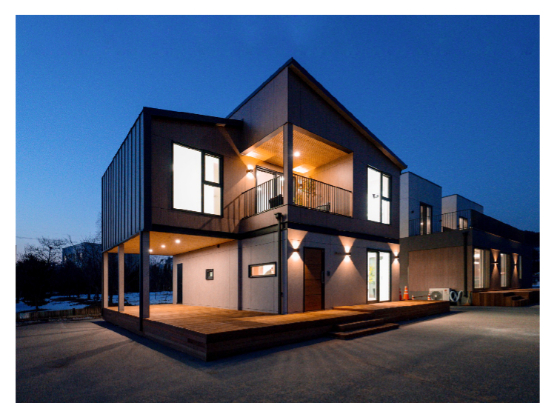 자이가이스트가 충남 당진 공장부지 내에 설치한 목조모듈러주택 Vol.35(35평형) 샘플하우스 전경./ 사진제공=GS건설
