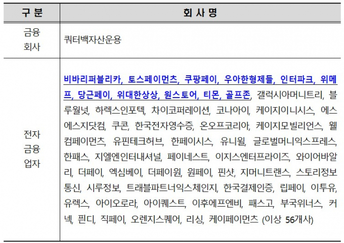금융사는 쿼터백자산운용, 전자금융업체는 토스(비바리퍼블리카), 토스페이먼츠, 쿠팡페이, 우아한형제들, 당근페이 등이다.
