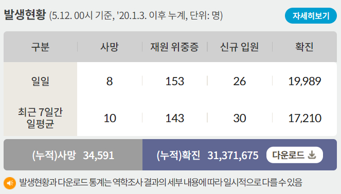 12일 코로나19 중앙방역대책본부(중대본)에 따르면 이날 0시 기준 국내 발생 확진자는 1만9989명, 해외 유입 확진자는 17명으로 누적 확진자 수는 3137만1675명(해외유입 7만8221명)을 기록했다. 위중증 환자는 153명으로 전날(157명)보다 4명 감소했고 일일 사망자는 8명으로 전날(12명)보다 4명 줄어들었다.