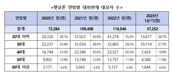 연령별 대위변제 대상자 수를 보면 올해 1분기 20대는 1만3677명으로 가장 많았고 ▲30대 1만114명 ▲40대 7429명 ▲50대 4388명 ▲60대 이상은 1644명이다.