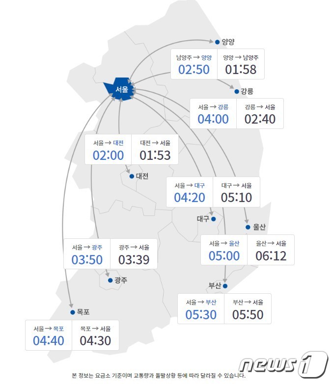 서울에서 지방까지 예상 소요 시간(오전 10시 요금소 출발 기준)은 △부산 5시간30분 △울산 5시간 △대구 4시간20분 △강릉 4시간 △양양 2시간50분(남양주 출발) △대전 2시간 △광주 3시간50분 △목포 4시간40분이다.