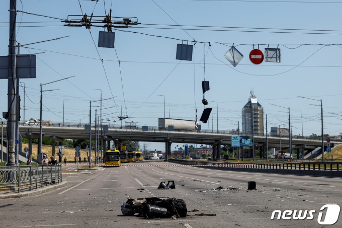 29일(현지시간) 러시아가 우크라이나에 미사일 11발을 동원해 우크라이나에 16번째 공습을 감행했다. 사진은 키이우에서 발견된 러시아 미사일 파편을 조사하는 우크라이나 경찰의 모습. 2023.05.29. ⓒ 로이터=뉴스1 ⓒ News1 박재하 기자