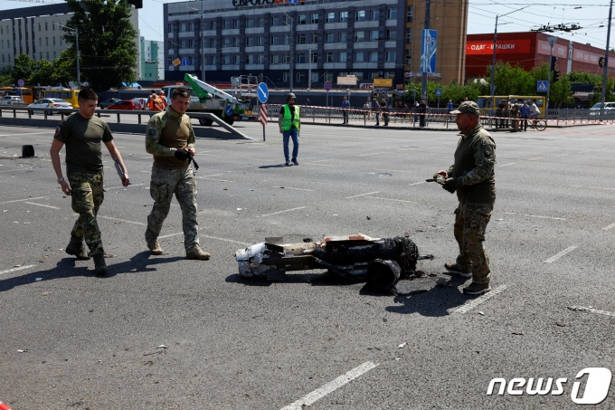 29일(현지시간) 러시아가 우크라이나에 미사일 11발을 동원해 우크라이나에 16번째 공습을 감행했다. 사진은 키이우에서 발견된 러시아 미사일 파편. 2023.05.29 ⓒ 로이터=뉴스1 ⓒ News1 박재하 기자