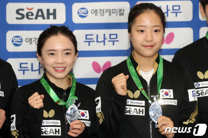 세계탁구선수권대회에서 20년 만의 최고 성적을 거두며 '더반의 기적'을 쓴 한국 탁구대표팀은 여자복식 신유빈-전지희 조가 은메달, 남자복식 장우진-임종훈 조가 은메달, 조대성-이상수 조가 동메달을 각각 목에 걸었다. 한국 탁구가 세계선수권에서 메달 3개 이상을 따낸 것은 2003년 파리 대회 이후 무려 20년만이다. 2023.5.31/뉴스1
