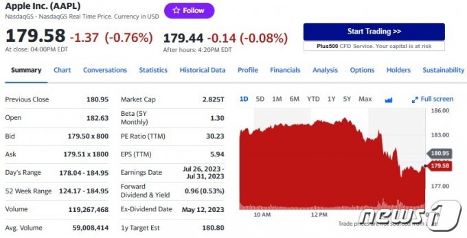 5일(현지시간) 뉴욕증시에서 애플은 전거래일보다 0.76% 하락한 179.58 달러를 기록했다.