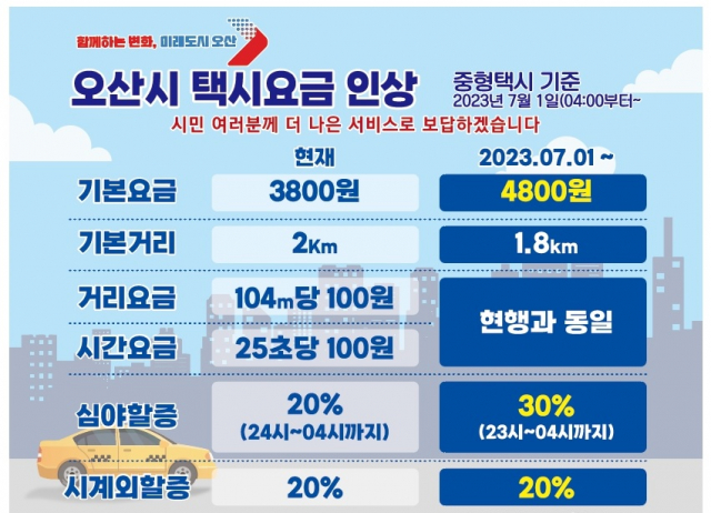 이번 택시요금은 경기도의 택시 운임·요율 변경 시행에 따른 것으로 기본요금은 3800원에서 4800원으로 1000원 인상된다. 기본요금이 적용되는 기본거리는 기존 2km에서 1.8km로 단축된다. 시간·거리 요금은 현재의 체계인 거리요금 104m 당 100원, 시간요금 25초당 100원을 유지했다.