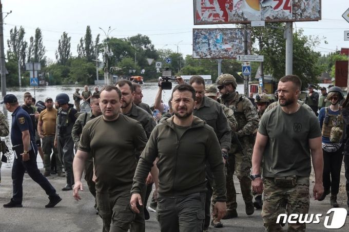 (서울=뉴스1) 박재하 기자 = 볼로디미르 젤렌스키 우크라이나 대통령이 카호우카댐 붕괴로 침수된 헤르손 지역을 방문했다.