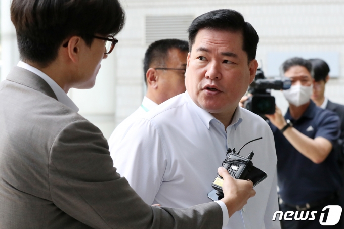 유동규 전 성남도시개발공사 기획본부장이 9일 오전 서울 서초구 중앙지방법원에서 열린 대장동 개발사업 관련 특정범죄가중처벌 등에 관한 법률위반(뇌물) 등 혐의 공판에 출석하며 취재진의 질문에 답하고 있다. 2023.6.9/뉴스1 ⓒ News1 민경석 기자