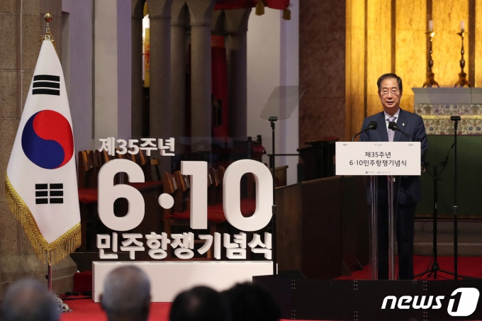 한덕수 국무총리가 지난해 6월10일 오전 서울 중구 대한성공회 서울주교성당에서 열린 제35주년 6.10 민주항쟁 기념식에서 기념사를 하고 있다./뉴스1 ⓒ News1 이광호 기자