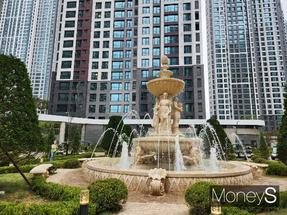 아파트에 들어서자마자 길이 280m, 높이 11m의 문주가 반겼다. 동간 공간은 140만주 꽃과 나무로 채운 다채로운 조경 시설로 꽉 차 있었다. 단지 내 조성된 산책로 주변에 전나무와 메타세쿼이아가 연이어 자리해 숲에 온 듯한 분위기를 자아냈다. 통상 낮은 높이의 묘목이 많은 신축 아파트임에도 이 단지엔 제법 키가 크고 곧은 소나무들이 방문객을 반겼다. 현장 관계자는 "입주자들의 올곧은 미래를 응원하고자 분양 완료 이후 미리 소나무를 주문해놓았다"고 설명했다.검암역 로열파크씨티 푸르지오 내 로열가든에 세워진 조형 분수대. 유럽 정원을 모티브로 했다./사진=정영희 기자