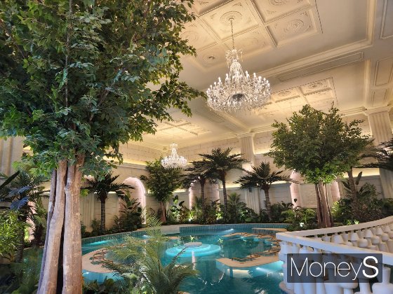 6성급 호텔을 방불케하는 수영장도 눈에 띄었다. 12개의 화려한 샹들리에와 핸드메이드 타일로 만들어진 공간 연출에 '호캉스'를 온 듯한 느낌을 받을 수 있다. 1단지에는 유아풀, 마사지풀, 유수물 등의 미니워터 파크가 설치된다. 2단지는 워터파크와 25m 길이의 3개 레인을 갖춘 수영장이 조성돼 있다. 검암역 로열파크씨티 푸르지오 1단지에 자리한 수영장의 모습. 화려한 샹들리에와 내부 인테리어가 눈에 띈다./사진=정영희 기자