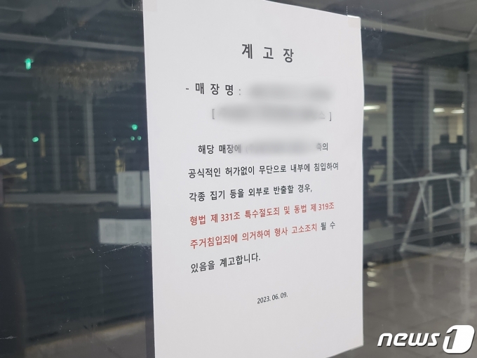 12일 경기 부천시에 위치한 해당 브랜드 헬스장 문에 붙은 계고장의 모습. 23.06.12 ⓒ 뉴스1 한병찬 기자