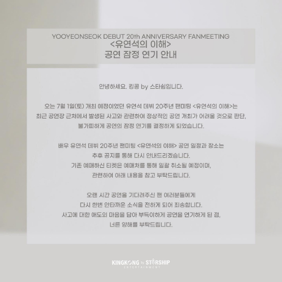 28일 배우 유연석의 소속사 킹콩 by 스타쉽 측은 "오는 7월1일(토) 개최 예정이었던 유연석 데뷔 20주년 팬미팅 '유연석의 이해'는 최근 공연장 근처에서 발생된 사고와 관련하여 정상적인 공연 개최가 어려울 것으로 판단, 불가피하게 공연의 잠정 연기를 결정하게 되었다"고 알렸다.