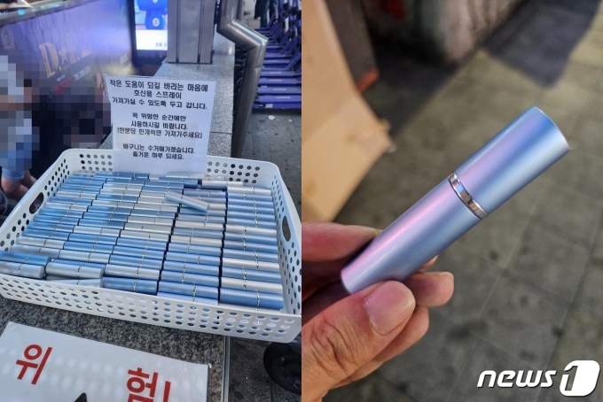 지난 4일 오후 서울 지하철 홍대입구역 출구에는 "작은 도움이 되길 바라는 마음에 호신용 스프레이 가져가실 수 있도록 두고 갑니다"라는 글과 함께 작은 공병에 담긴 호신용 스프레이가 바구니에 쌓여 있었다.