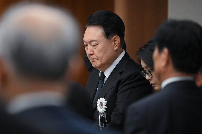 윤석열 대통령의 부친 고(故) 윤기중 연세대 명예교수의 발인이 17일 진행됐다. 사진은 17일 서울 서대문구 신촌세브란스병원 장례식장에서 열린 부친 고 윤기중 연세대 명예교수 발인식에 참석하는 윤석열 대통령과 부인 김건희 여사. /사진=뉴시스