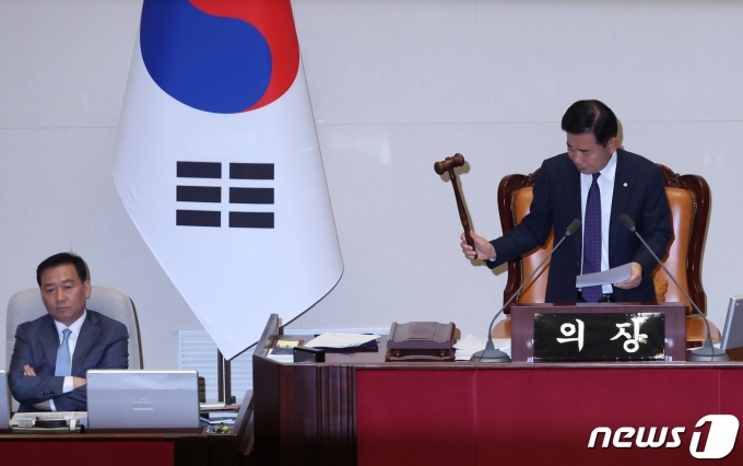 김진표 국회의장이 21일 오후 서울 여의도 국회에서 열린 제410회 국회(정기회) 제8차 본회의에서 의사봉을 두드리며 이재명 더불어민주당 대표에 대한 체포동의안의 가결을 알리고 있다. 2023.9.21/뉴스1 ⓒ News1 송원영 기자